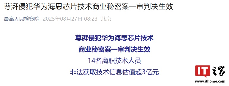 IT之家 8 月 27 日消息求股票配资,据最高人民检察院今日消息,尊湃通讯科技(南京)有限公司(以下简称“尊湃”)侵犯华为海思芯片技术商业秘密案一审判决生效,14 名离职技术人员非法获取技术信息估值超 3 亿元。